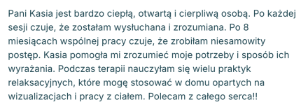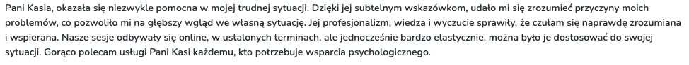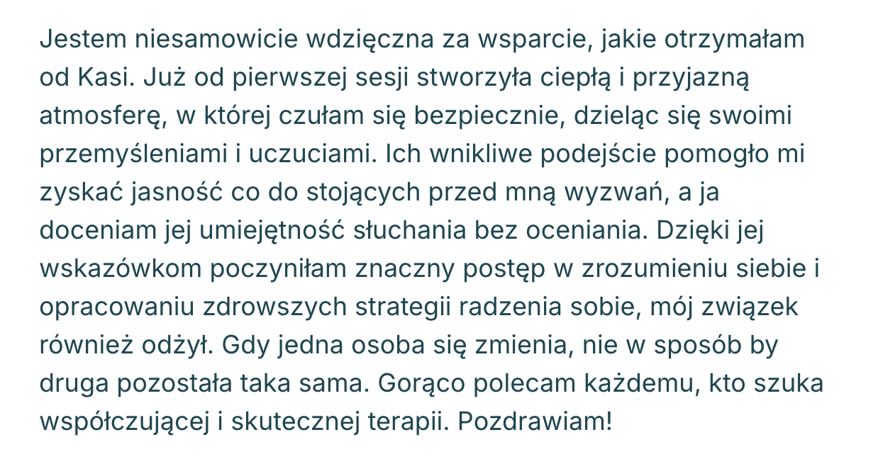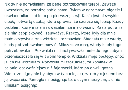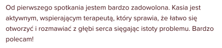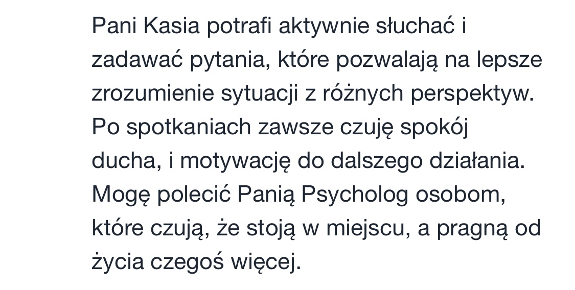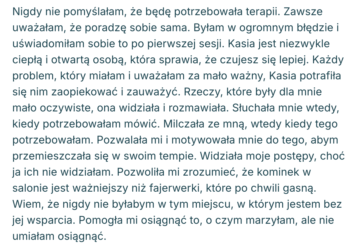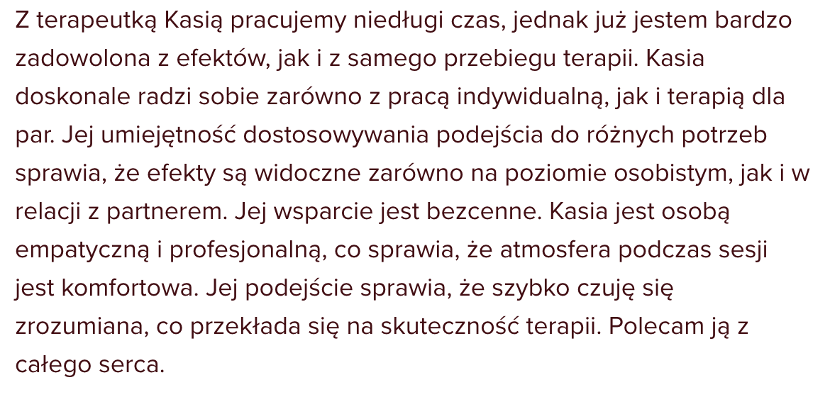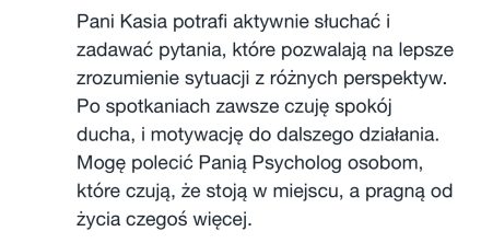 Ja sprawdzam, czy jestem w stanie Tobie wystarczająco pomóc, a Ty sprawdzasz, czy praca ze mną Tobie pasuje. Jeśli sposób, w jaki mówię, pracuję czy coś innego w pewnym stopniu Tobie przeszkadza / “uwiera”, to nie będę dla Ciebie odpowiednią osobą do współpracy. 😉 Czynnikiem leczącym w terapii głównie jest relacja, która zawiązuje się między klientem a terapeutą / psychologiem, zatem to jest bardzo ważny czynnik.